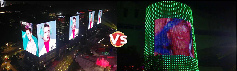 利亚德从事LED显示屏产品已经有20年历史了,实力雄厚,产品质量过硬。那么我们的LED共形屏跟传统LED点光源、洗墙灯有哪些区别呢,可以从一下几个方面对比: